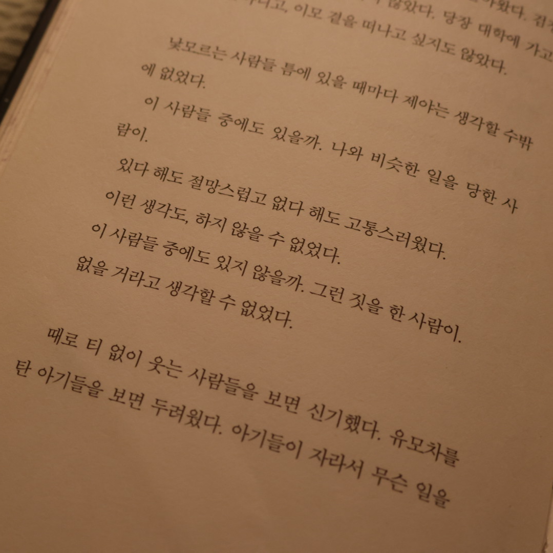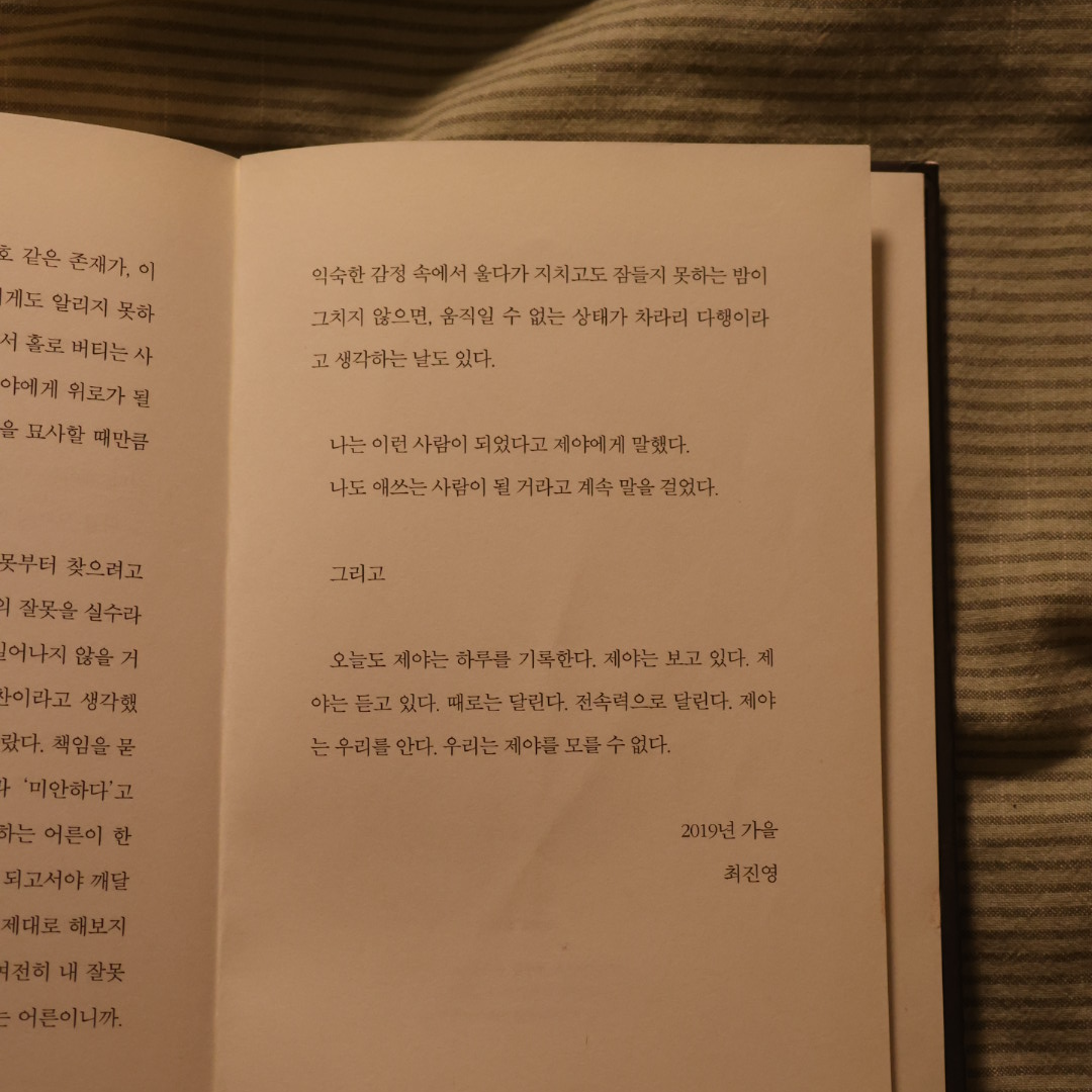 • 이모는 제야의 손을 잡고 가만히 말했다. 어른으로서 미안해, 제야야. 정말 미안해. 제야는 울고 싶지 않았다. 울면 멈출 수 없고, 밤새 울어야 할지도 몰랐다. 그러면 약해지는 것 같았다. 제야는 벌떡 일어나 앉고 싶었다. 일어나서 세수를 하고 기지개를 켜고 크게 소리를 내고 괜찮다고 말하고 싶었다. 강해지 고 싶었다. 하지만 꼼짝할 수 없었다. 손가락 하나 움직일 수 없었다. 굳은 채로, 무거운 채로 할 수 있는 건 우는 일뿐이었다. 제야는 할 수 있는 일을 했다. p. 155